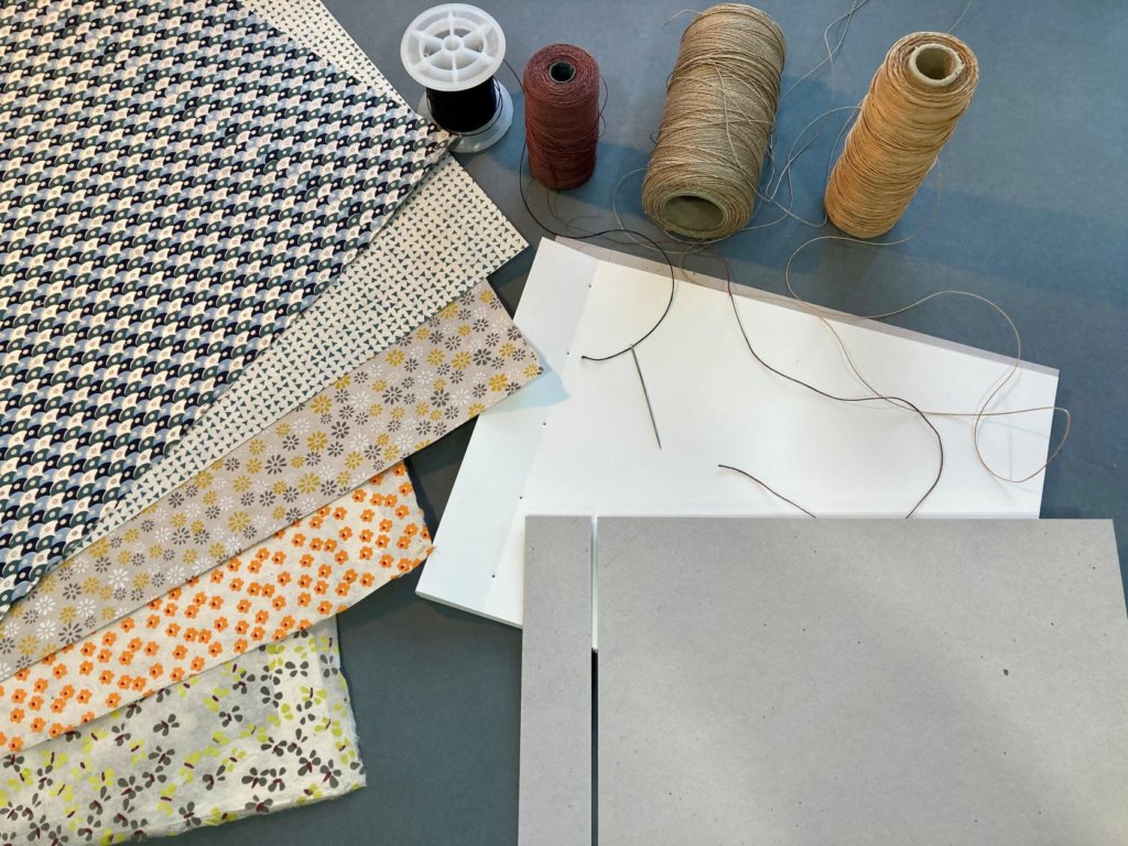 Une première approche du façonnage par la création de carnets fantaisie en accordéon, décorés avec des matériaux divers et une couverture en papier marbré.